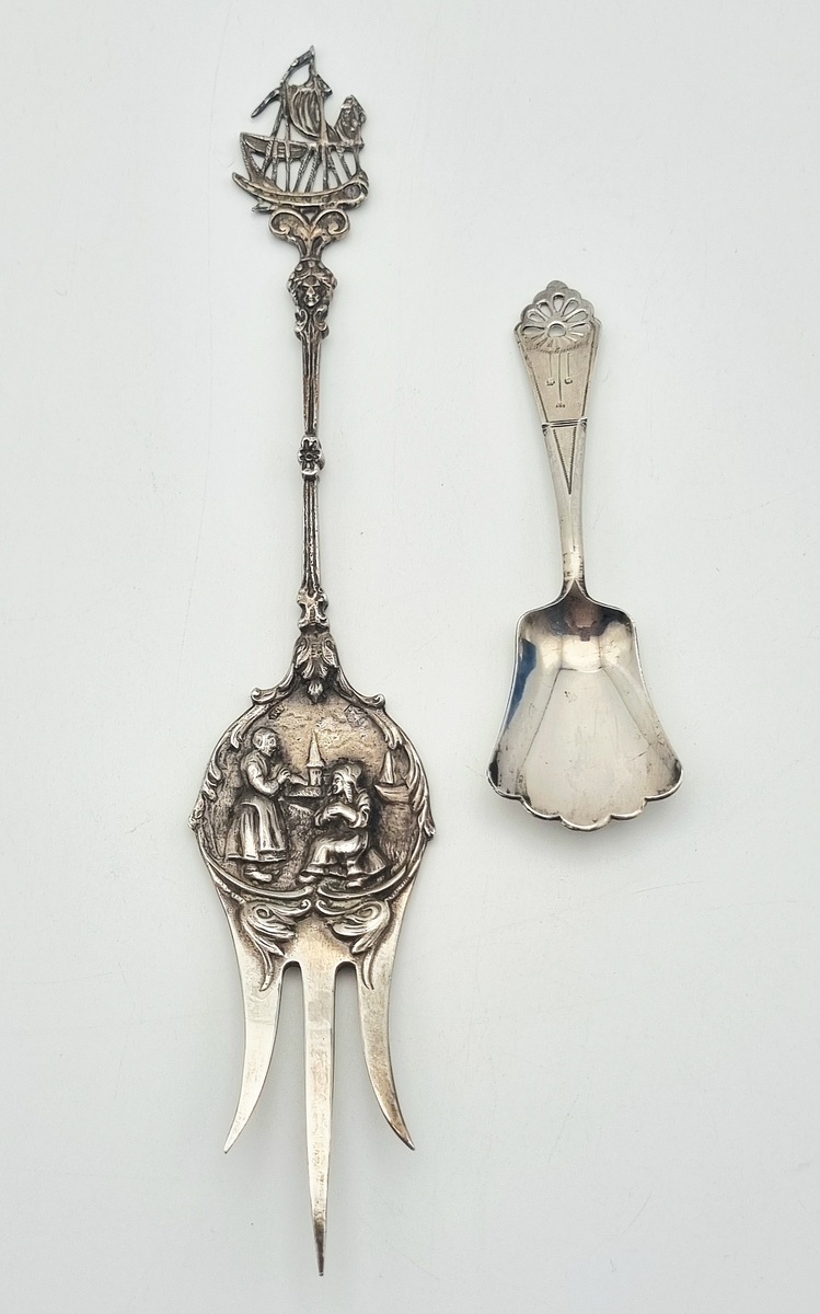 Nederlands klein zilverwerk (835/1000) bestaande uit een zilveren vork en een suikerschepje. De vork is gemerkt lopende leeuw 2, jaarletter X 1957, meesterteken NV Van Kempen en toont een gedetailleerd reliëf van vissers. Het suikerschepje is gemerkt lopende leeuw 2, minervakopje meesterteken HA (Den Hartog) en jaarlletter L 1921 en is uitgevoerd in een schelpvorm met een gestileerde florale Art Deco-decoratie.