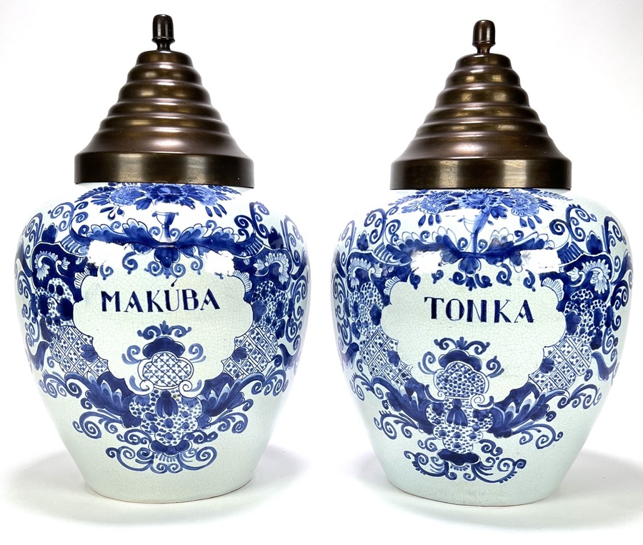 Een paar aardewerken tabakspotten met Delfts blauwe handbeschildering en craquelé glazuur. De potten dateren uit het midden 20e eeuw en vertonen een neostijl decoratie met Chinese en barokke invloeden. voorzien van de tabaksnamen 'MAKÚBA' en 'TONKA' en afgedekt met gedraaide messing deksels.