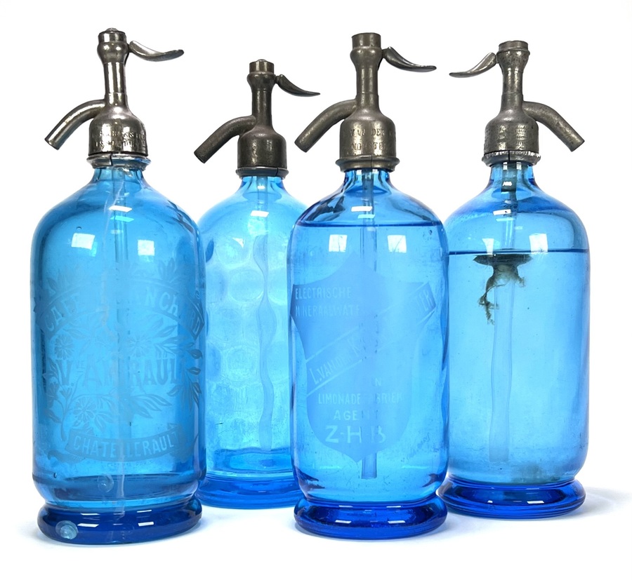 Lot met vier kobaltblauwe spuitflessen uit de Art Deco periode, vervaardigd middels persglastechniek met vernikkelde messing sifons en glazen stijgbuizen. De flessen dateren ca. 1910–1930 en twee flessen bevatten teksten van de oorspronkelijke drankenfabrikanten. Eén fles heeft een florale Art Nouveau ets uit Frankrijk (“Chatellerault”), terwijl het andere exemplaar functionele tekst voor een Nederlandse limonadefabriek (“Z-H-B”) draagt. Eén fles heeft een decoratief honingraatmotief.