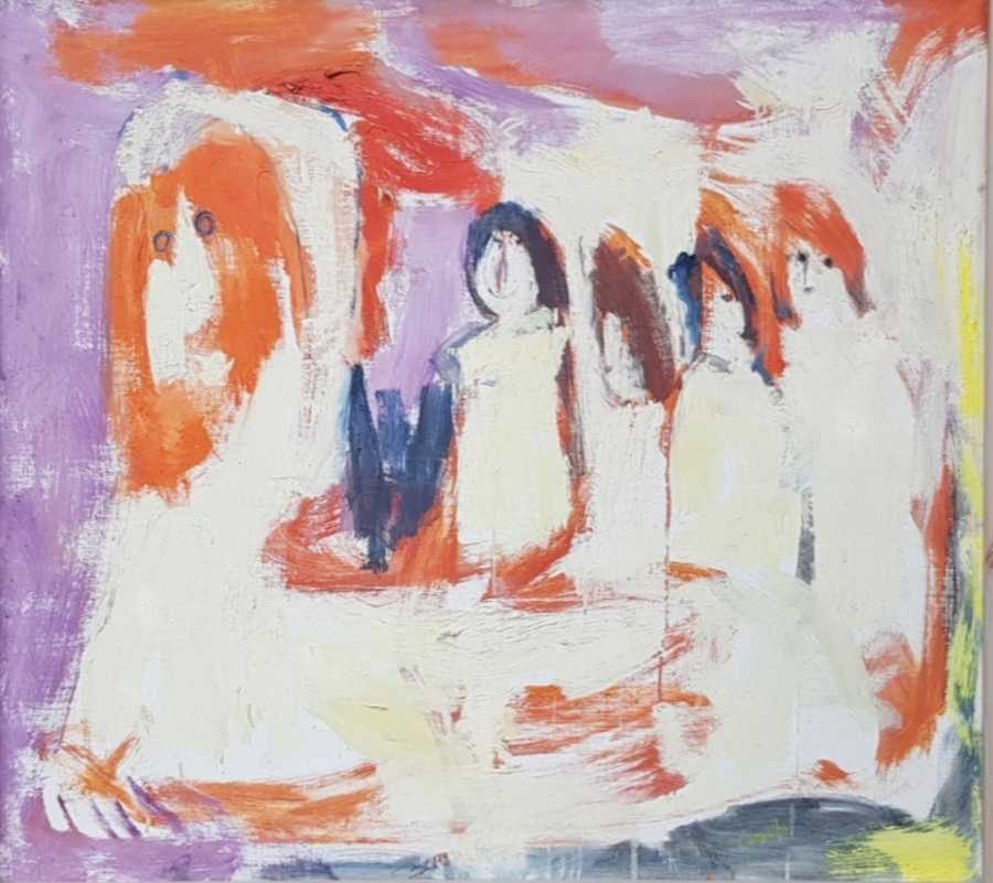 Olieverfschilderij door de Nederlandse kunstenaar Karel Frank Carvalho (1916–1972), gesigneerd 'Carvalho', uitgevoerd in olieverf op doek. Het werk is een figuratief expressionistische voorstelling uit midden 20e eeuw, met een ruwe pasteuze schildertechniek. De voorstelling toont een abstracte groep figuren in een levendig kleurenpalet van wit, oranje, violet en donkerblauw.