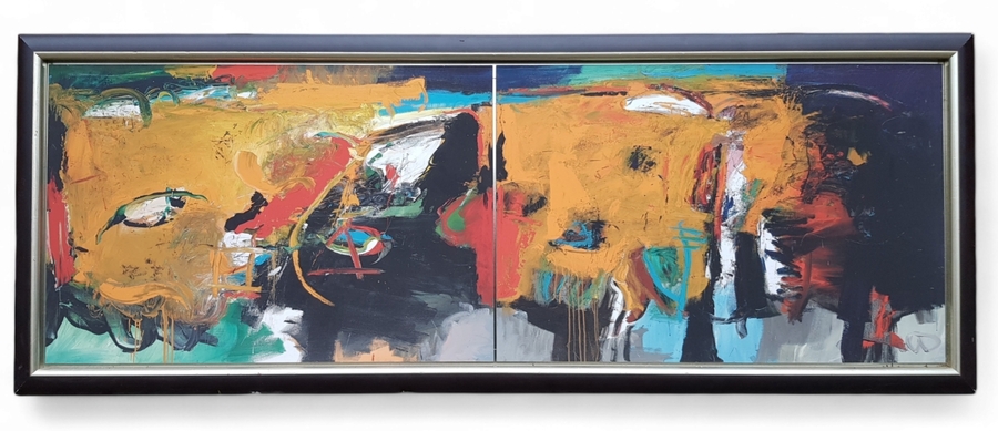 Diptiek, een abstract expressionistisch werk door de Nederlandse kunstenaar Gerriet Postma (1932–2009), eind 20e eeuw. Het werk is uitgevoerd in giclée op MDF-paneel en toont een horizontaal landschap. De compositie wordt gedomineerd door lagen in oranje, zwart en helderblauwe tonen.