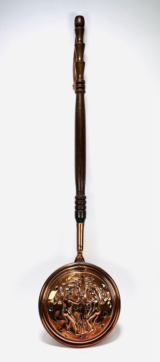 Koperen beddenpan, tweede helft 19e eeuw, bestaat uit een ronde koperen pan met een gedreven reliëf op de deksel met een Bijbelse motief van Adam en Eva. De pan is verbonden met een lange donkere gedraaide houten steel.