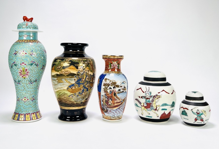 Lot Aziatisch porselein bestaande uit drie vazen en twee gemberpotten met deksels. De objecten zijn gedraaid en handbeschilderd in famille rose, famille verte en Satsuma en tonen figuratieve scènes en florale motieven. De onderzijden bevatten Chinese merken. De verzameling is geproduceerd voor de exportmarkt en dateert uit de tweede helft 20e eeuw.