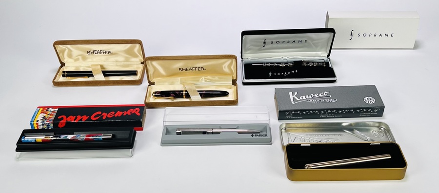 Vulpennen en balpennen van onder andere Sheaffer, Parker en Kaweco, daterend uit de periode 1950–2000. Het lot bevat vulpennen in klassieke stijl, een Aziatische vulpen met ingegraveerde karakters en een Jan Cremer Art pen. De pennen zijn vervaardigd uit hars en metaal met goud plated accenten.