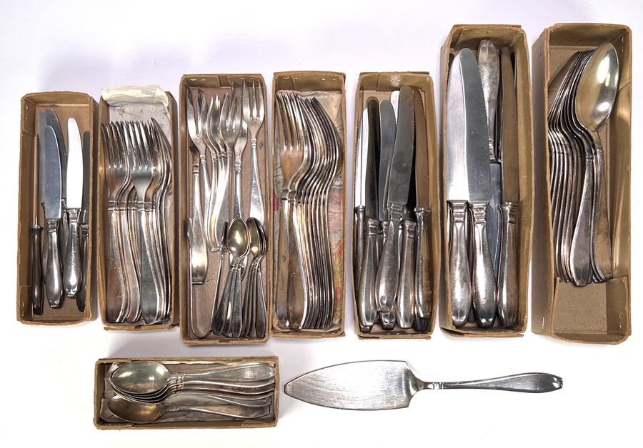 Plet bestek in klassiek gladde stijl, vervaardigd van gegalvaniseerd metaal, ca. 1920–1950. De set bevat messen, vorken, lepels en een taartschep met een strak heft. De stukken zijn grotendeels georganiseerd in de oorspronkelijke kartonnen verpakking.