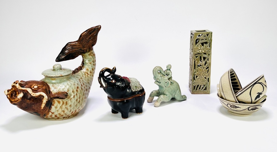 Aziatisch keramiek uitgevoerd in aardewerk en diverse glazuren waaronder celadon en majolica, circa 1880–1940. Onder andere een visvormige kan met geschubde reliëfdecoratie, twee olifant figuren waarvan één met een berijder, een opengewerkte vaasje met floraal decor en drie aan elkaar gelijmde kommen met craquelé glazuur en inktdecoratie.