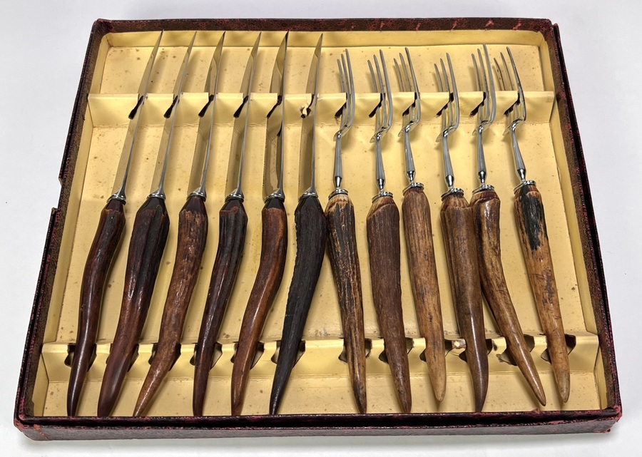 Twaalfdelige wildbestek, zes messen en zes vorken, van Harrison Fisher & Co. uit Sheffield, Engeland. De set dateert uit circa 1900–1930 en is uitgevoerd in roestvrij staal met handvatten van hertengewei. Het lemmet draagt de naam "TRAFALGAR" en de fabriekssignatuur. De messen en vorken bevinden zich in de originele doos.