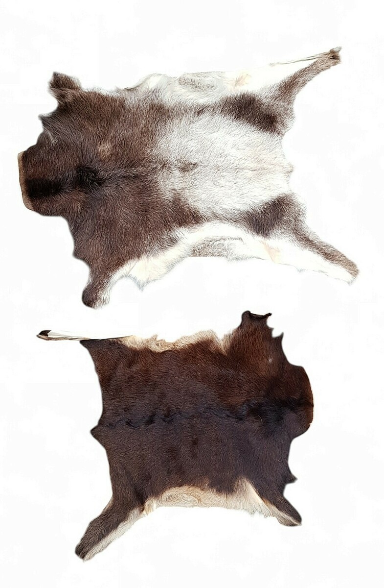 Lot van twee geitenhuiden, de huiden zijn gelooid en behouden hun natuurlijke contour met pootdelen. Het vachtpatroon is donkerbruin en wit tot grijs, 21e eeuw.