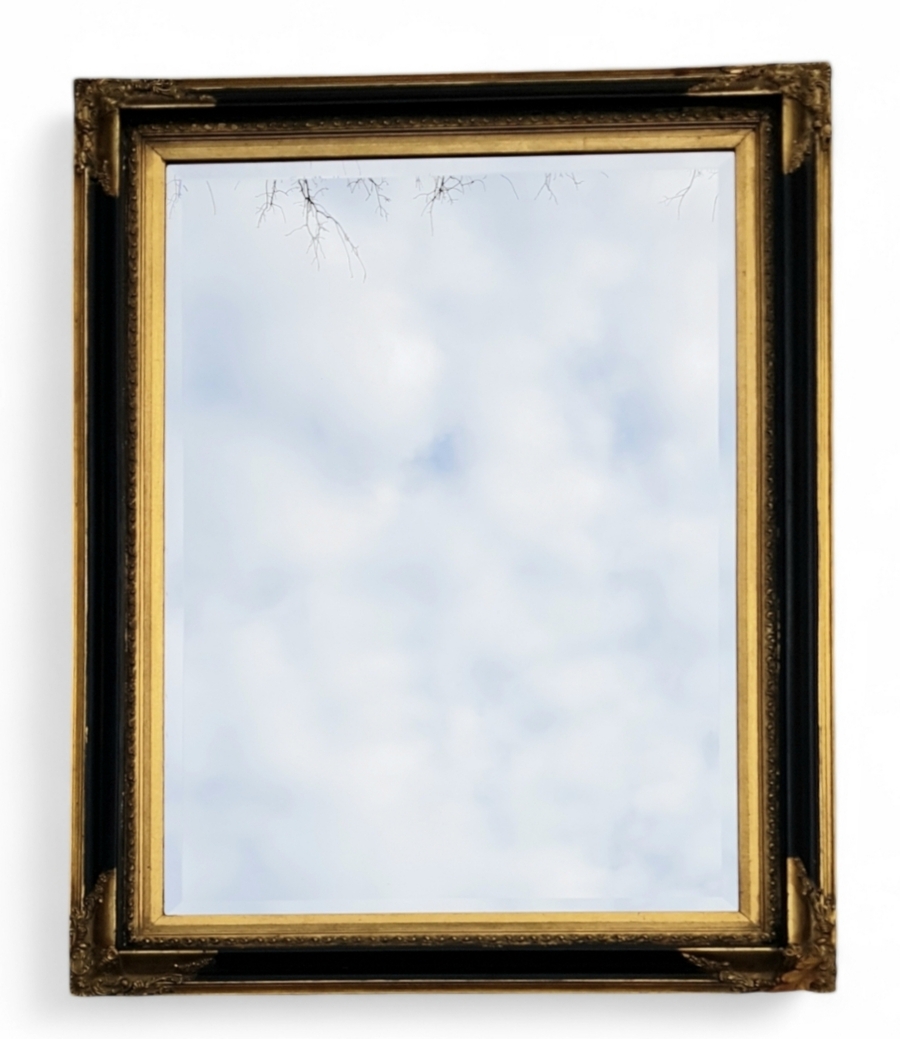 Rechthoekige wandspiegel uitgevoerd omstreeks 2000, met een gelaagde houten lijst. De lijst heeft een afwerking van zwart lak en goudkleurige profilering. Het spiegelglas is over de gehele omtrek facetgeslepen.