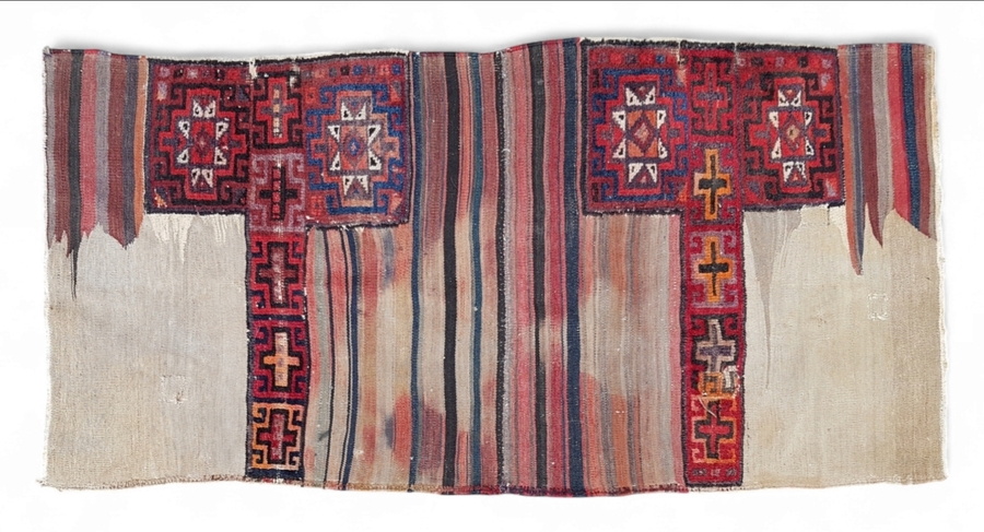 Dit handgeweven wandkleed van wol uit de Turkmeense culturele context is te dateren in het midden van de 20e eeuw. De techniek combineert vlakweven met geknoopte pool en is uitgevoerd in een tribaal geometrische stijl. Het toont herhaalde ruitvormige guls in dieprode en blauwe tinten.