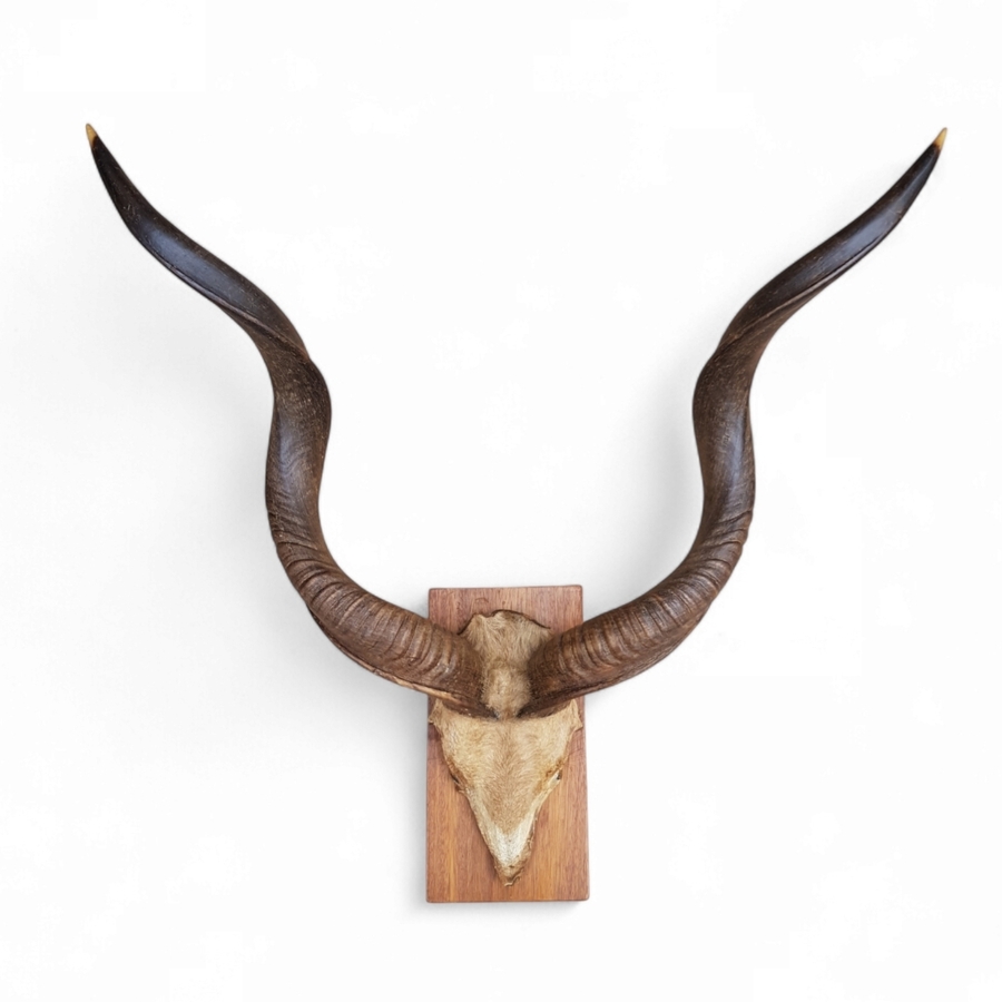 Gemonteerd gewei van de spiraalvormig gedraaide hoorns van een mannelijke grote koedoe (Tragelaphus strepsiceros), Zuid-Afrika. De hoorns zijn gemonteerd op een rechthoekig houten schild, midden 20e eeuw.