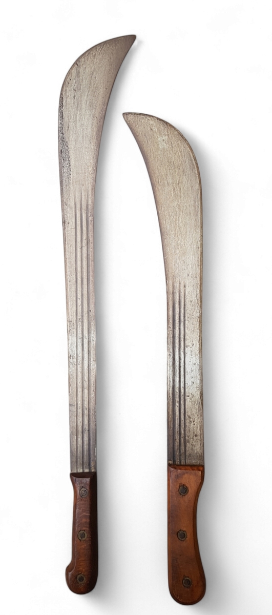 Een paar industriële kapmessen van staal met houten handgrepen, vervaardigd door F. Martindale & Co. Ltd. uit Birmingham, Engeland. De messen hebben een licht gebogen blad met longitudinale ribbels ter versteviging en zijn gestempeld met "Crocodile" handelsmerk en "MADE IN ENGLAND". Eerste helft 20e eeuw.
