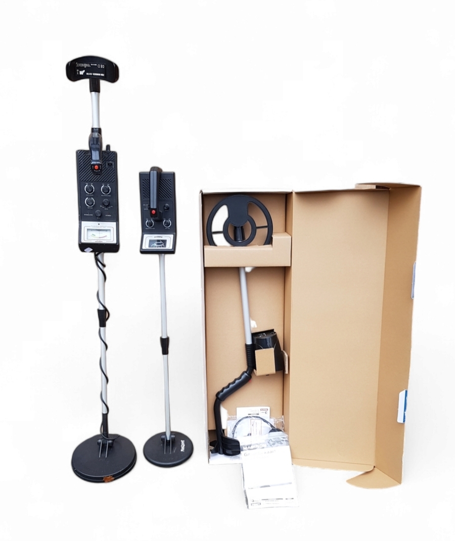 Drie Magnon MD-1140 metaaldetectoren, waarvan één exemplaar nieuw in de originele doos en twee gemonteerd. Vervaardigd uit kunststof en aluminium met VLF (Very Low Frequency) techniek, de detectoren dateren uit de 21e eeuw.