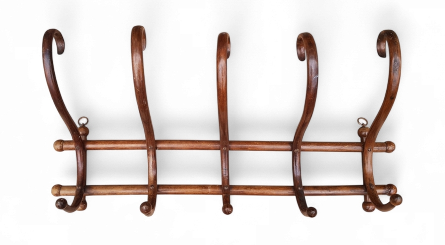 Houten wandkapstok van gebogen hout vervaardigd uit beukenhout met een donkere beits. De kapstok heeft vijf lange haken met karakteristieke Art Nouveau krullen aan de bovenzijde en tien ophangpunten. Het functionele meubel is kenmerkend voor de industriële productie van Thonet uit Midden-Europa en dateert uit het eerste kwart 20e eeuw.