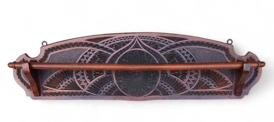Houten wandkapstok met een brede rugplaat en een gedraaide ophangstok, vervaardigd uit beits geaccentueerd loofhout. De kapstok is rijk gedecoreerd met een symmetrische kerfsnede in de stijl van Friese volkskunst. De decoratie bestaat uit geometrische en gestileerde florale patronen, datering ca. 1880–1920.