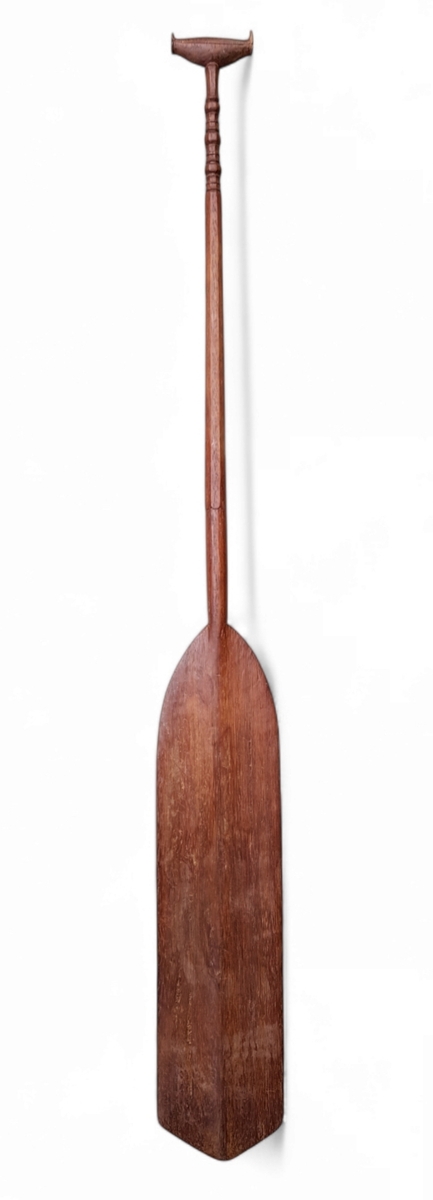 Traditionele etnografische peddel van massief hardhout, vervaardigd middels houtsnijwerk uit één stuk met een roodbruine beits. De peddel heeft een langwerpig breed blad en een kenmerkend T-vormig handvat bovenop de gesneden schacht. Eerste helft 20e eeuw.