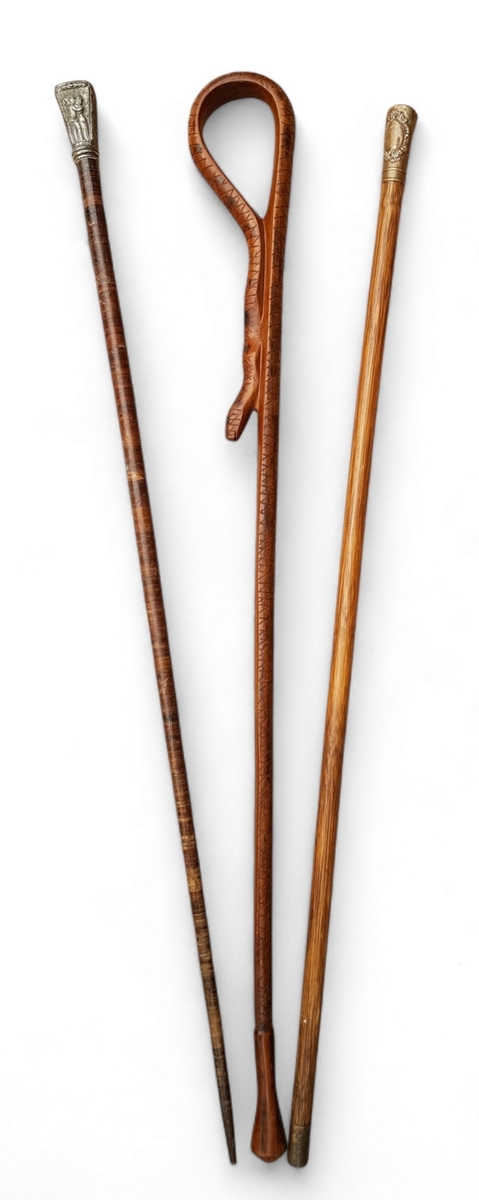 Drie houten wandelstokken, daterend uit midden 20e eeuw, variërend in stijl; twee hebben slanke schachten met metalen knoppen en één is een hardhouten volkskunst model met een uit één stuk gesneden haakvormig handvat. De metalen knoppen zijn gedecoreerd met reliëf.