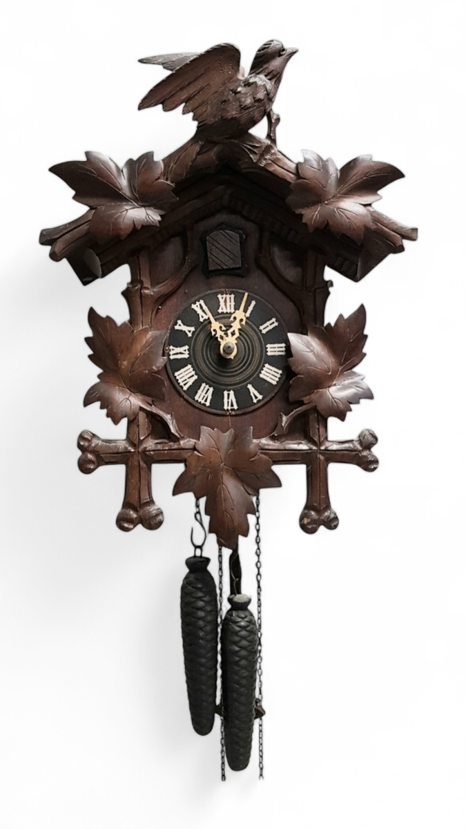 Traditionele koekoeksklok uit het Zwarte Woud Duitsland, ca. 1960–1990. De klok is gemaakt van gebeitst hout met gestileerde bladeren als decoratie en bevat een mechanisch uurwerk. De zwarte wijzerplaat is voorzien van goudkleurige Romeinse cijfers en wijzers. Aan metalen kettingen hangen dennenappelvormige gewichten.