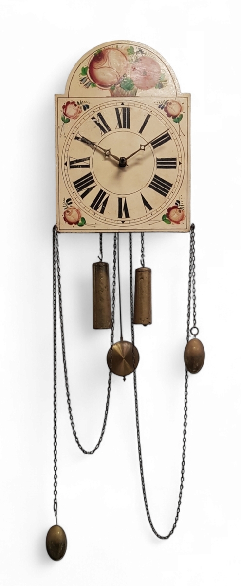 Traditionele Zwarte Woud appelklok met een vierkante houten plaat en halfronde top. De klok is versierd met handbeschilderde florale motieven. Het mechanisme heeft een kettingaandrijving met messing gewichten en slingers die onder de plaat hangen. Dit type klok is kenmerkend voor Duitsland en dateert uit de 19e eeuw.