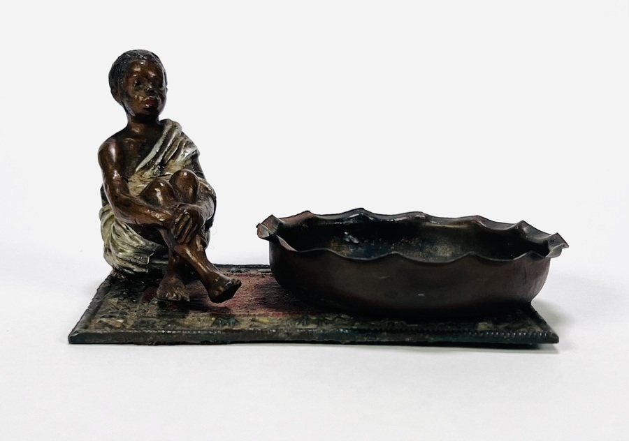 Wit metalen gegoten beeld met zittende jongen in wit gewaad naast een gegolfde, ovale schaal, begin 20e eeuw. Uitgevoerd in gepatineerd en gepolychromeerd metaal op een voetplaat met tapijtdecor. Weense stijl met koloniale invloeden, ongesigneerd.