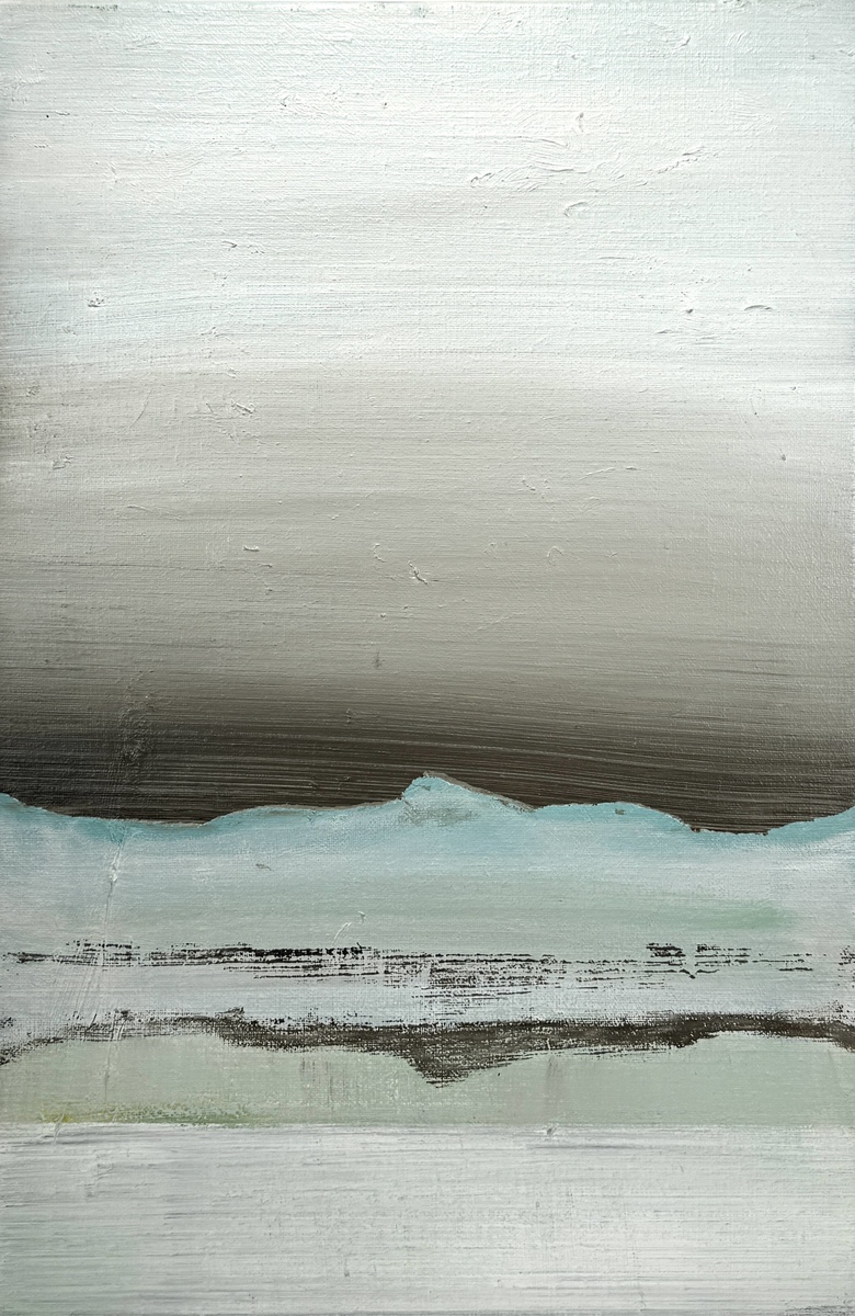 Schilderij met de titel "Iceland Stillframe #2", uitgevoerd in abstracte stijl door de Nederlandse kunstenaar Joost Verhagen (1975) in 2016. Het werk is acrylverf op doek en toont een atmosferisch landschap in horizontale kleurvlakken van grijs, wit en turkoois. Het doek is verso gesigneerd en gedateerd en inclusief het Certificaat van Authenticiteit (COA-122).