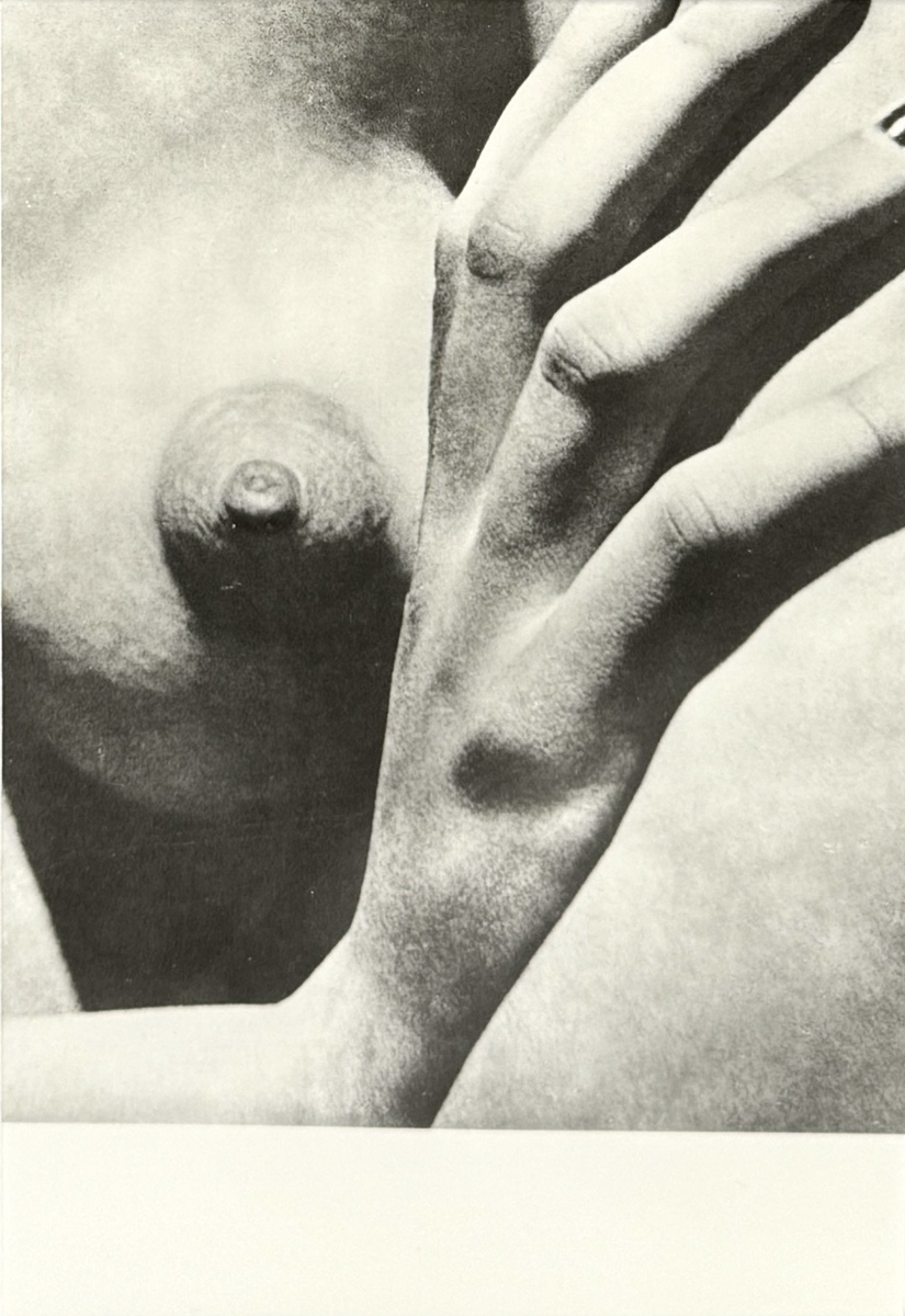 Vintage zilvergelatinedruk, gedateerd ca. 1970, van een naaktstudie uit 1941 door de Tsjechische fotograaf Karel Ludwig (1919–1977). De zwart-witfoto toont een grafische uitsnede van een borst en hand en is een archiefafdruk (press print) op FB-papier van IMS Vintage Photos. Verso Certificaat van Authenticiteit.