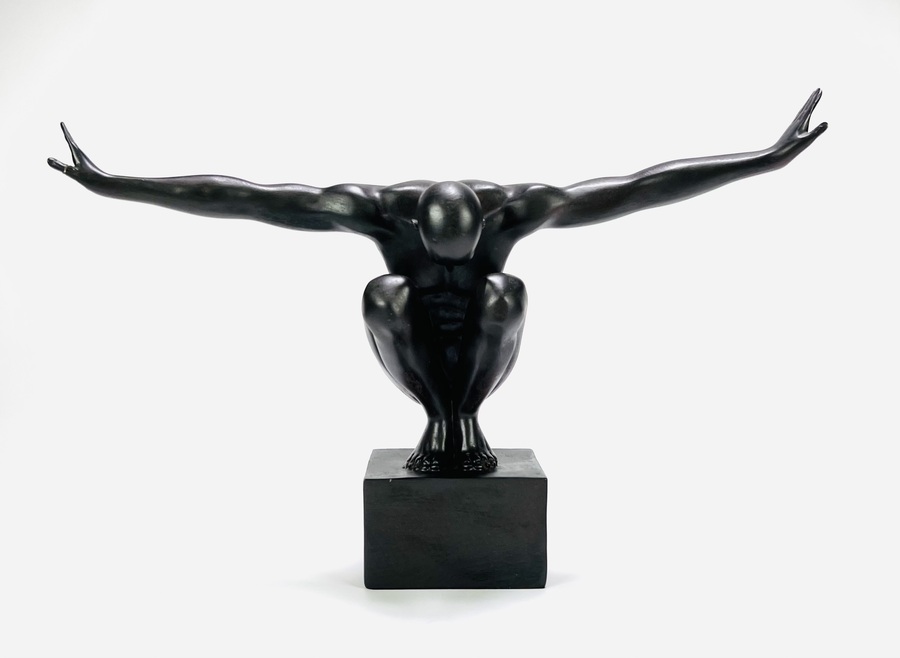 Decoratief beeld van gegoten kunststof (hars/polymeer) met een matte zwarte coating, gemonteerd op een vierkante sokkel. Het beeld is uitgevoerd in moderne klassieke stijl en daterend uit de 21e eeuw. De beeld stelt een naakt atletisch figuur voor in een gehurkte, dynamische houding met gestroomlijnde anatomie.