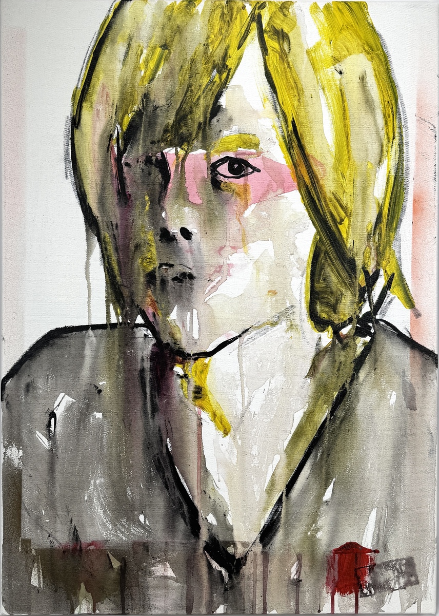 Expressief portretschilderij van acrylverf op doek, gemaakt in 2017 door de Ecuadoraanse kunstenaar gevestigd in Nederland onder het pseudoniem A BROKEN UNIVERSE. Het werk is uitgevoerd in neo-expressionistische stijl met vloeibare penseelvoering en toont een portret met fel geel haar. Verso signatuur en datreing.