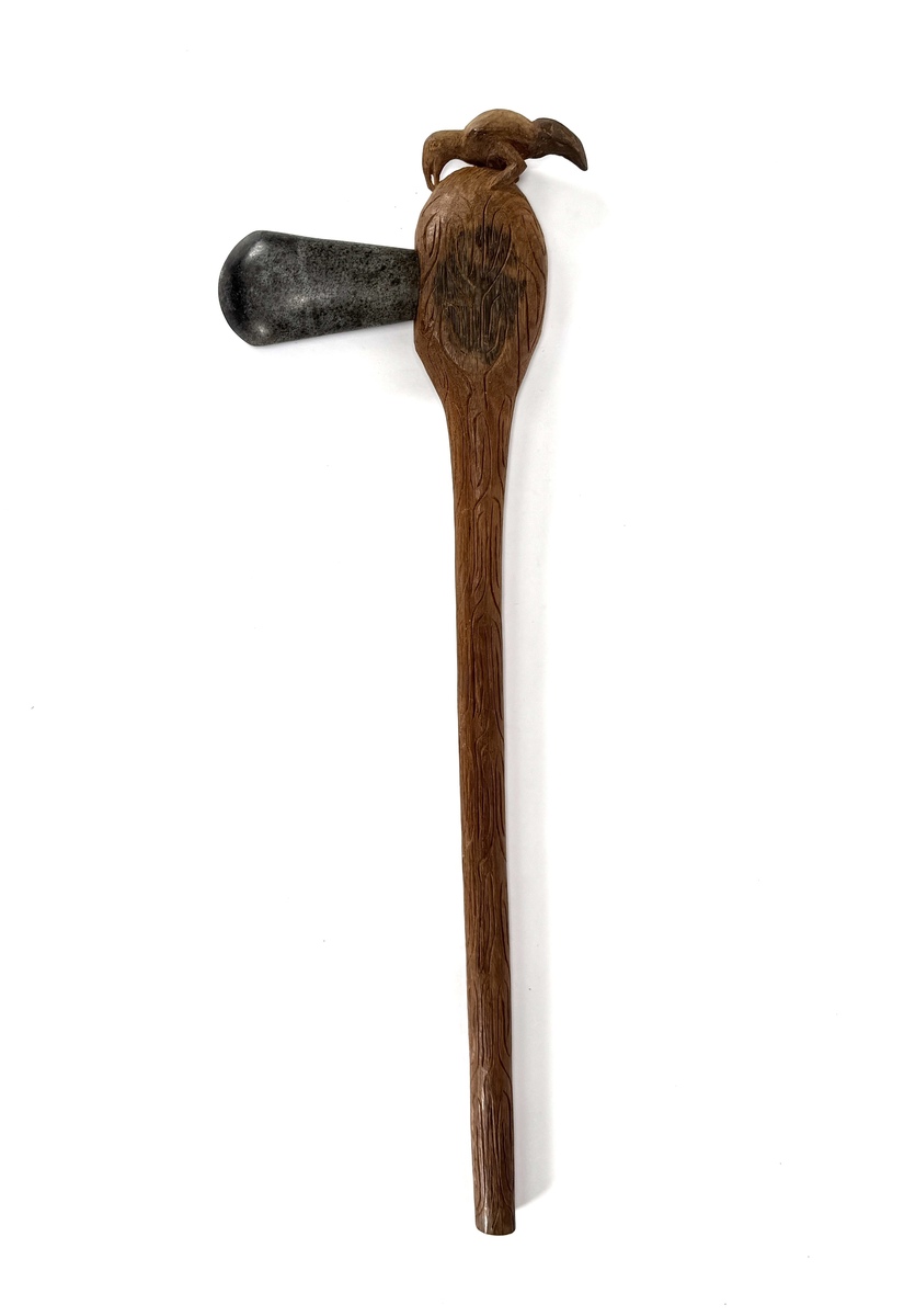 Houten ceremonieel bijl uit midden 20e eeuw, met gepolijste stenen kop en gesneden handvat voorzien van decoratieve graveringen en een dierfiguur op het uiteinde. Uit het Cepic gebied in Papua Nieuw Guinea. Het lange handvat is rijk versierd, de overgang steen-hout strak uitgevoerd.