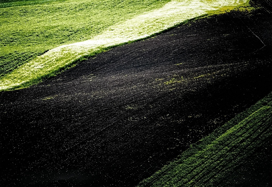 Kleuren fotografische afdruk met de titel "Paesaggio Marsciano", gemaakt in 2009 door de Italiaanse fotojournalist Giorgio Pegoli (1938). Het werk is uitgevoerd in abstracte landschapsfotografie en toont geploegde velden in scherpe diagonale banden van helder groen en diep zwart. Verso informatie en signatuur.