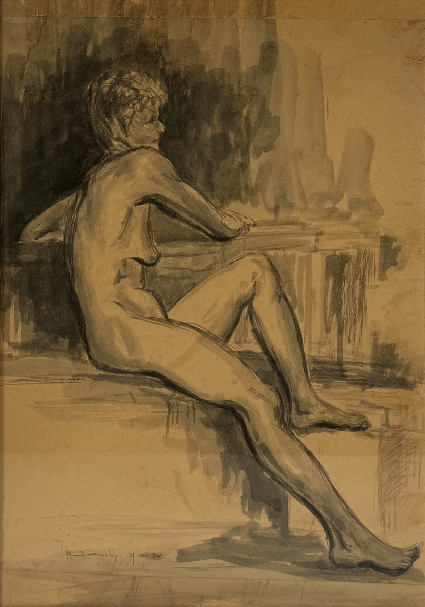 Figuratieve tekening in Oost-Indische inkt op papier, daterend uit 1984. Het werk toont een zittend naakt in een moderne expressionistische stijl, linksonder gesigneerd en gedateerd '84.