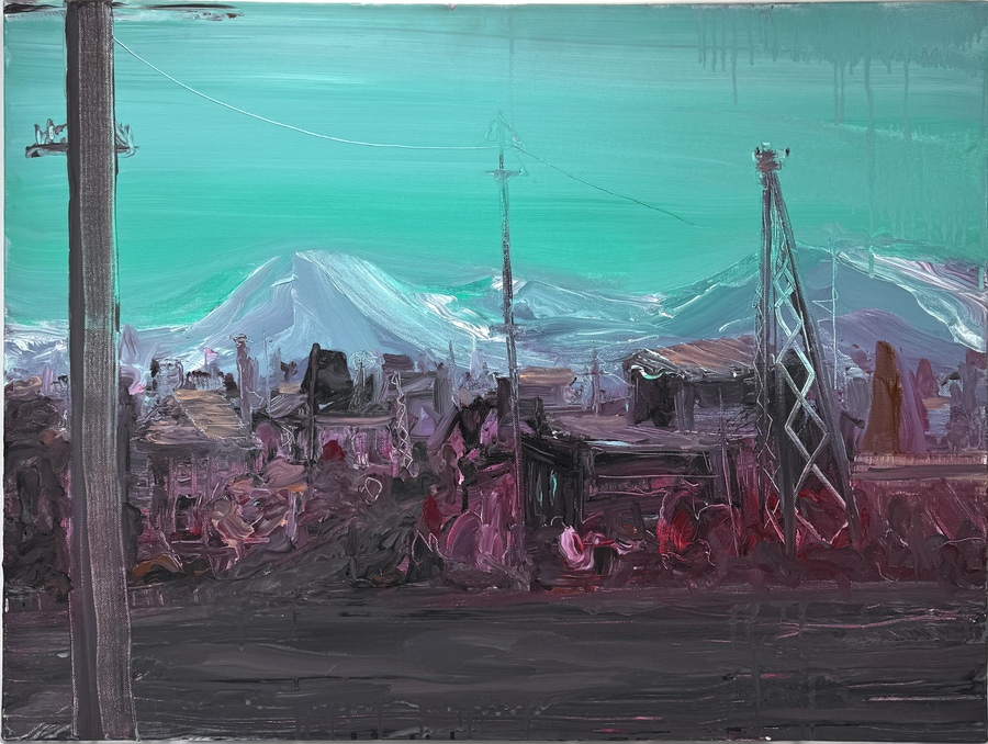 Expressief landschapsschilderij van acrylverf en inkt op doek, gemaakt in 2009 door de Nederlandse kunstenaar Edwin Jans (1976). Het werk is uitgevoerd in expressionistische stijl met impasto en toont een rauw stadsgezicht voor een massief berglandschap. Het werk is verso gesigneerd en gedateerd.