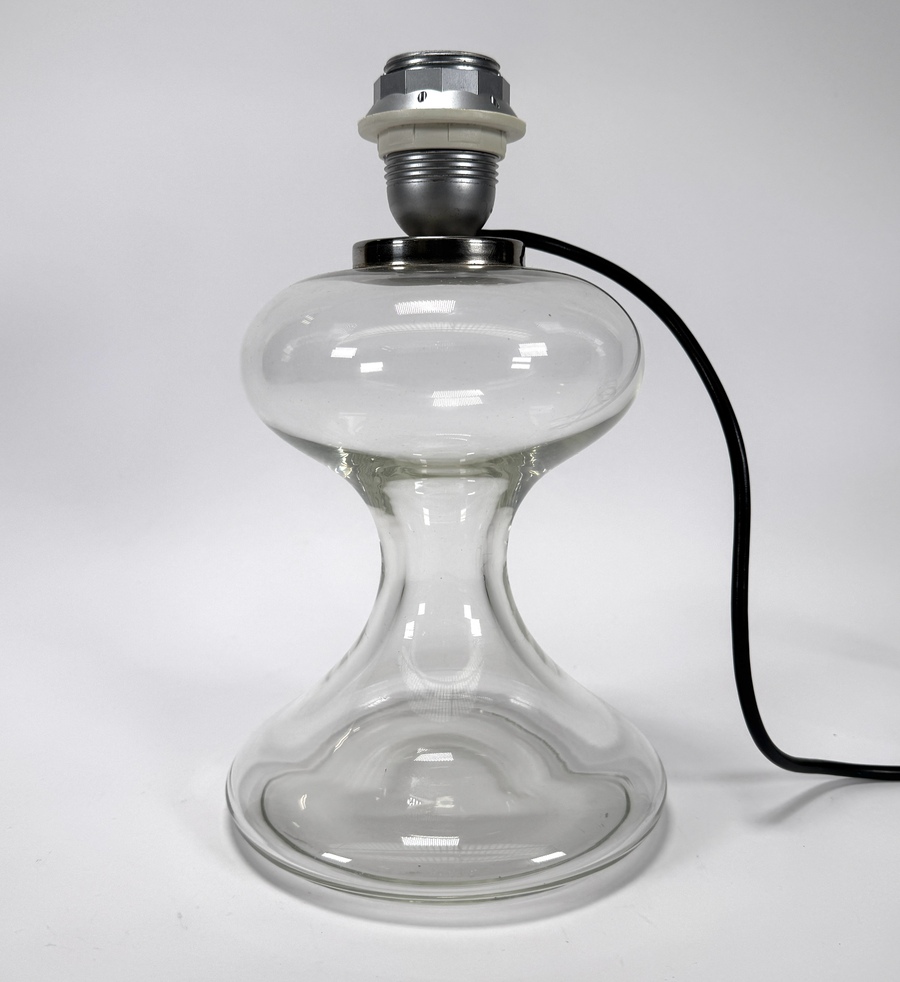 Design tafellamp van mondgeblazen helder glas, toegeschreven aan de serie ML1 (M60S) van de Duitse ontwerper Ingo Maurer (1932–2019). De lamp dateert uit de jaren 1960 en is uitgevoerd in minimalistisch modern design met een zichtbare metalen fitting.