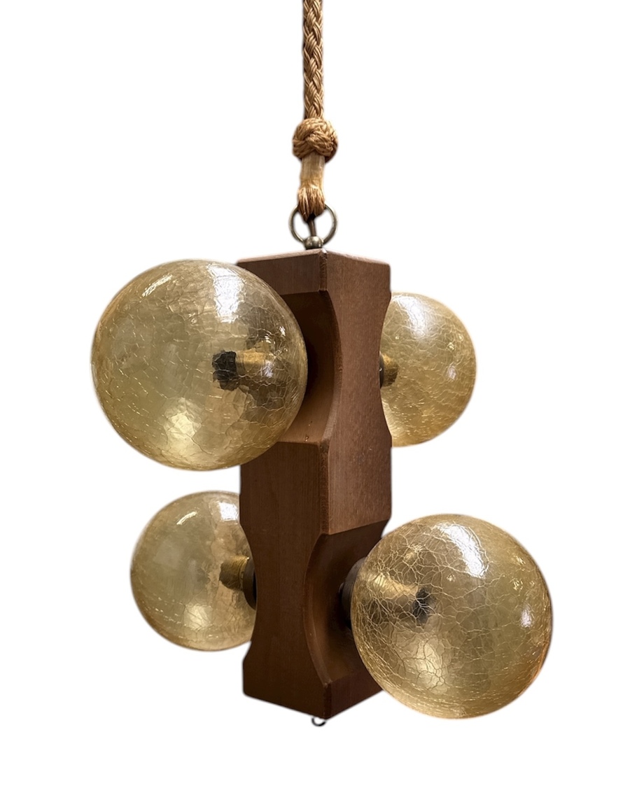 Hanglamp in de Mid-century modern stijl met invloeden van Space Age, daterend uit de jaren 1970. De lamp bestaat uit een kern van gebeitst hout met vier bolvormige lampenkappen van craquelé glas in een warme amberkleur en hangt aan een dik henneptouw.