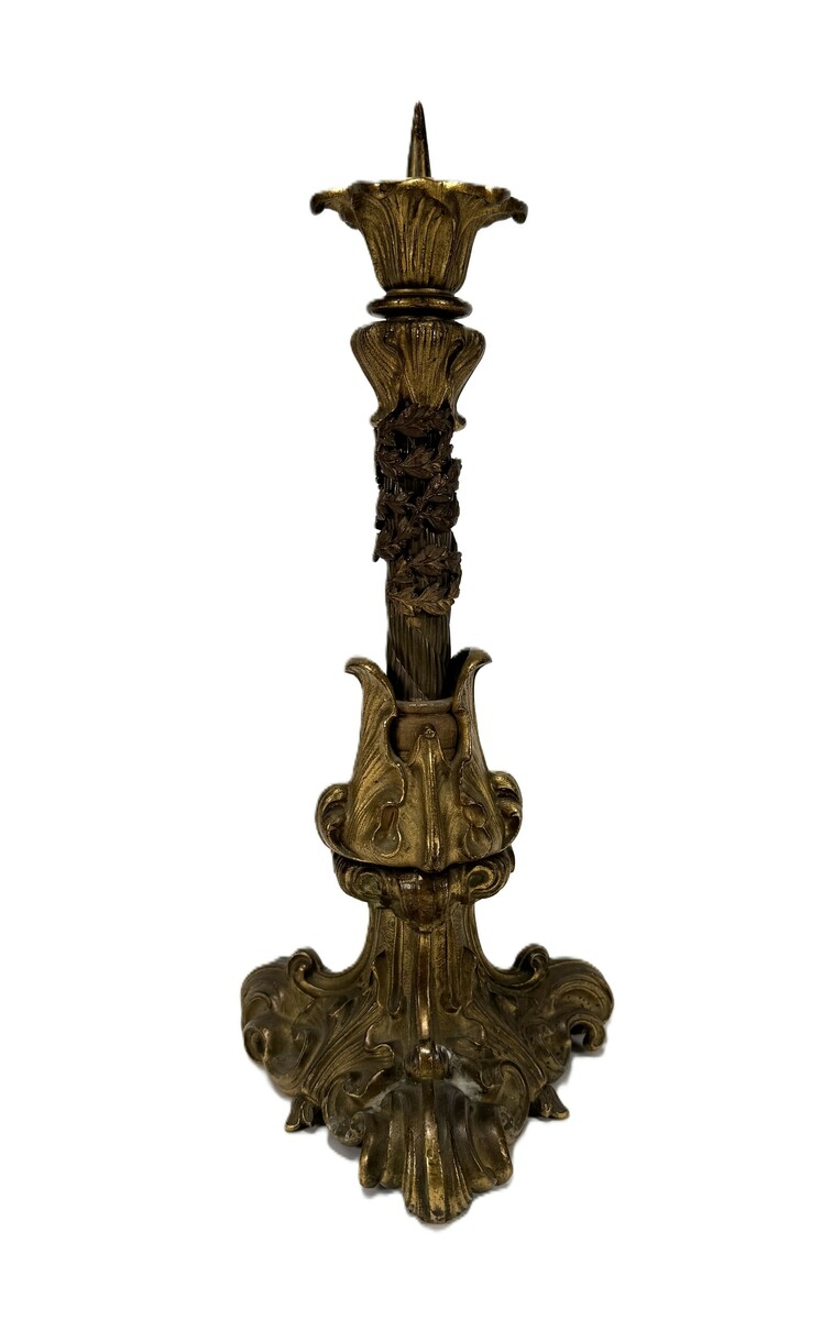Antieke kandelaar van gegoten messing, uitgevoerd in rijke neobarokke stijl uit het einde van de 19e/begin 20e eeuw. De kandelaar heeft een verticale opbouw op een driekantige voet met rolwerk en acanthusbladeren. De stam is versierd met een spiraalvormig rankmotief en de afwerking suggereert een kerkelijke herkomst.