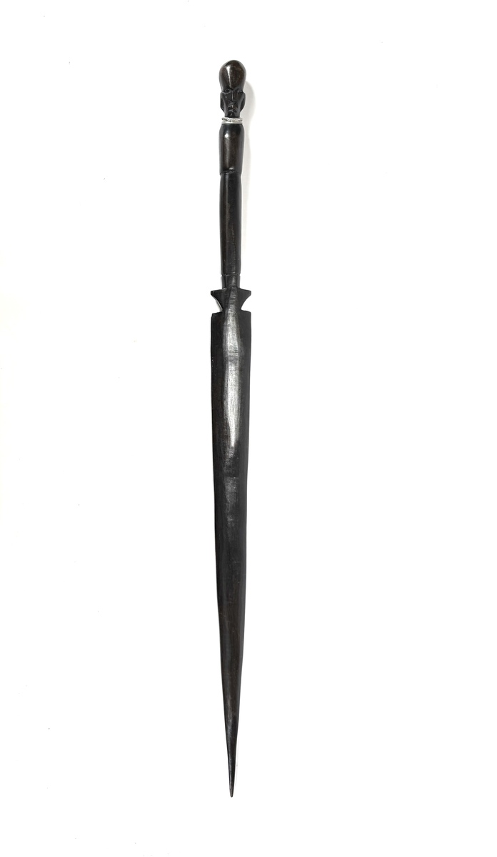 Houten zwaard uit Centraal-Afrika, midden 20e eeuw, vervaardigd uit donker hardhout met gesneden antropomorf handvat en een smal, spits toelopend blad. Het handvat toont een gestileerde menselijke figuur met langgerekt hoofd, geometrische gelaatskenmerken en een metalen halsring. Uitgevoerd in houtsnijwerk en gepolijst, met een ceremoniële en symbolische functie.