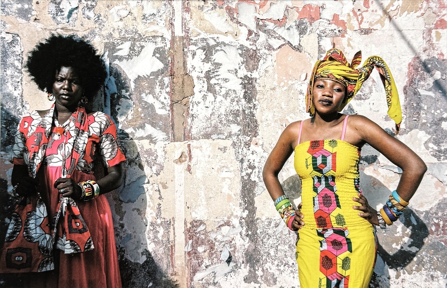 Hedendaagse kleurenfoto met de titel "2 getinte vrouwen voor de drukke muur" van de Franse fotograaf Bertrand Fèvre (1957). De foto uit 2016 toont twee vrouwen in felgekleurde Afrikaanse kleding tegen een verweerde muur. Verso informatie, gesigneerd en vermelding e.a. (épreuve d'artiste).