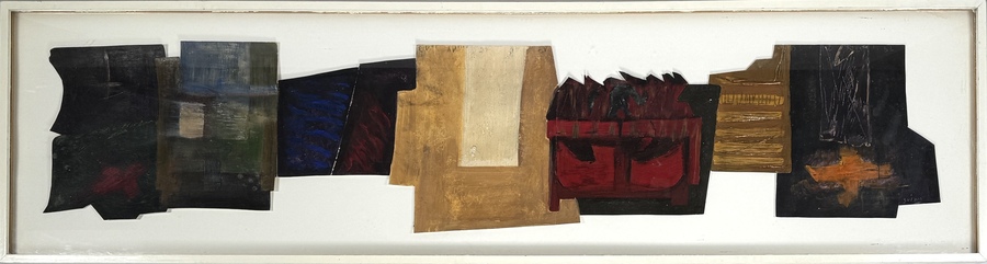 Abstract schilderij in gemengde techniek op papier, gemonogrammeerd S.J. en gedateerd 1993. Het werk bestaat uit uitgesneden en samengevoegde vlakken met expressief kleurgebruik in rood, blauw, zwart en oker. De horizontale compositie toont een collageachtige opbouw met duidelijke penseelstructuren en kraslijnen.