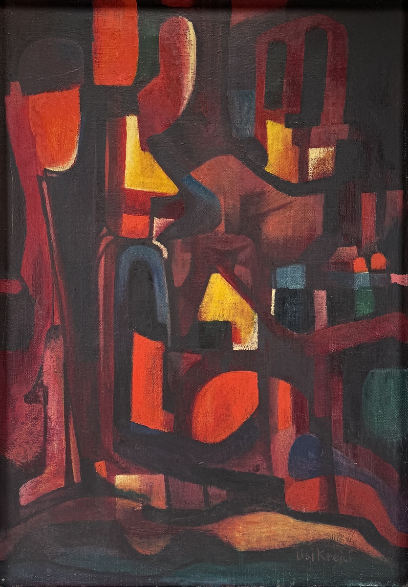 Abstract-expressionistisch schilderij door Usi Krejci, uitgevoerd in olieverf op doek, daterend ca. 1970, Tsjechië. De compositie toont overlappende geometrische en organische vormen in rood-, oker-, paars- en groentinten, Het werk is rechtsonder gesigneerd.
