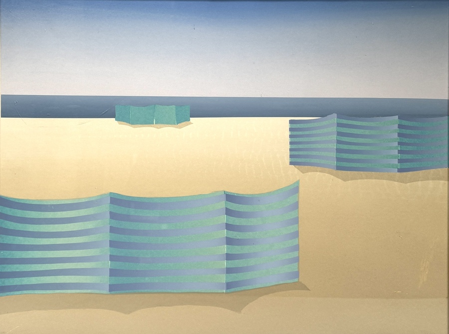 Minimalistische zeefdruk op papier door de Nederlandse kunstenaar Jurjen Fontein (1949), daterend uit laatste kwart 20e eeuw. Het werk toont een geometrisch abstract strandlandschap met gestreepte windschermen in blauw en groen. Rechtsonder in potlood gesigneerd en oplagenummer 4/40.