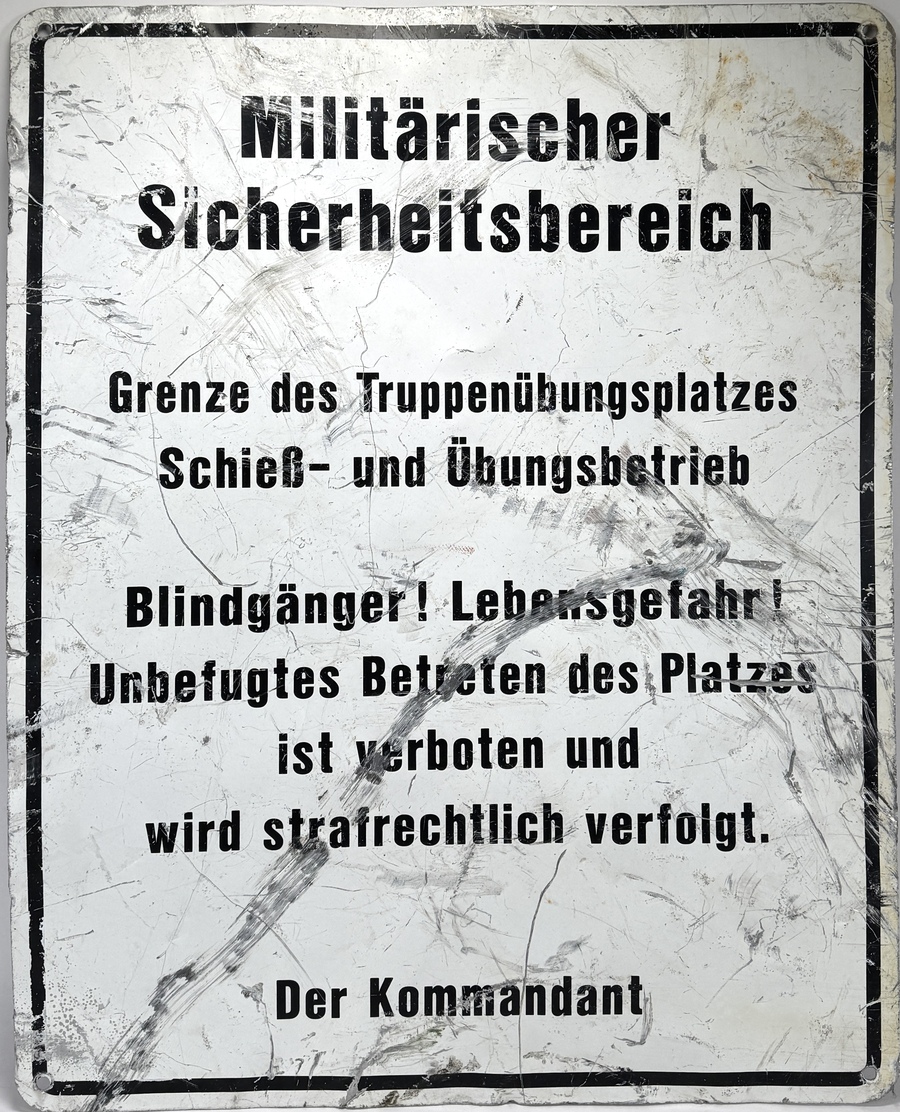 Duits rechthoekige waarschuwingsbord van metaal met zwarte opdruk op een lichte ondergrond, uitgevoerd in een functionele stijl voor militaire signalisatie. Het bord dateert uit de tweede helft 20e eeuw (Koude Oorlog) en waarschuwen in het Duits tegen het betreden van een militair oefenterrein en gevaar voor blindgangers.