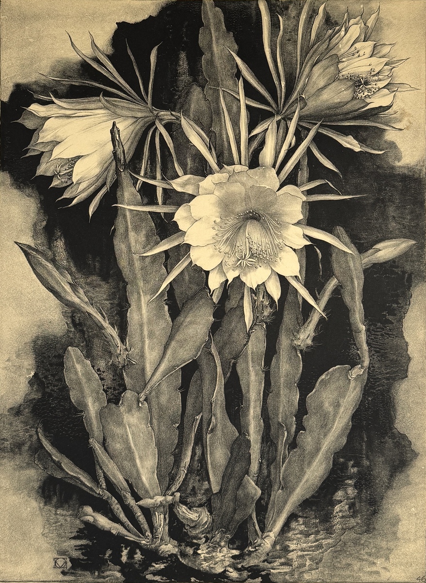 Botanische grafische ets door Nederlandse kunstenaar Dirk van Gelder (1907–1990). Dit werk uit 1928 is uitgevoerd in magisch realisme en toont een gedetailleerde weergave van cactusbloesem tegen een diepe, donkere achtergrond. Het werk is handmatig gesigneerd met potlood en voorzien van het monogram 'DvG', met in de plaat de nummering 46.