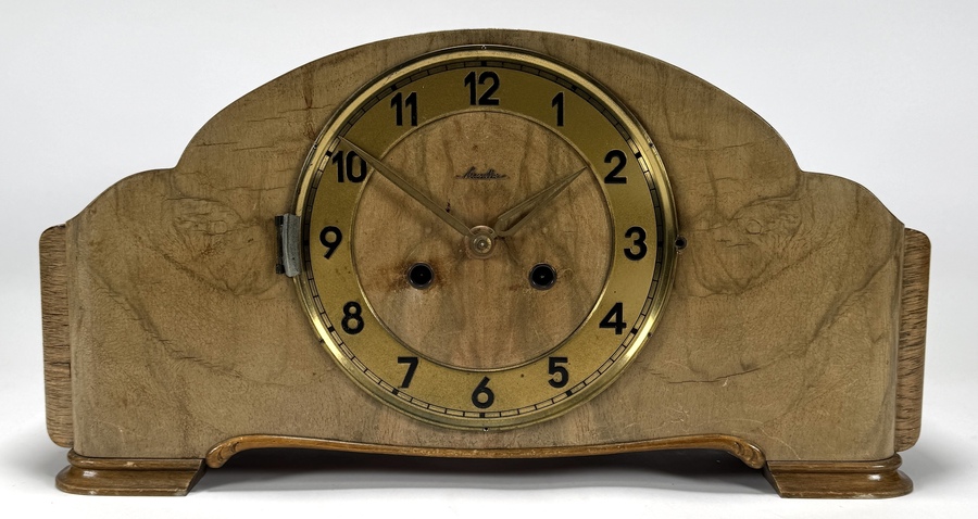 Art Deco pendule van hout met notenfineer, geproduceerd door de Duitse fabriek Mauthe, daterend uit de jaren 1930 met een symmetrische gestroomlijnde kast. De pendule bevat een mechanisch uurwerk van messing met slagwerk en een ronde messing wijzerplaat. Het fineer vertoont een opvallend gevlamd patroon, kenmerkend voor de Art Deco periode.
