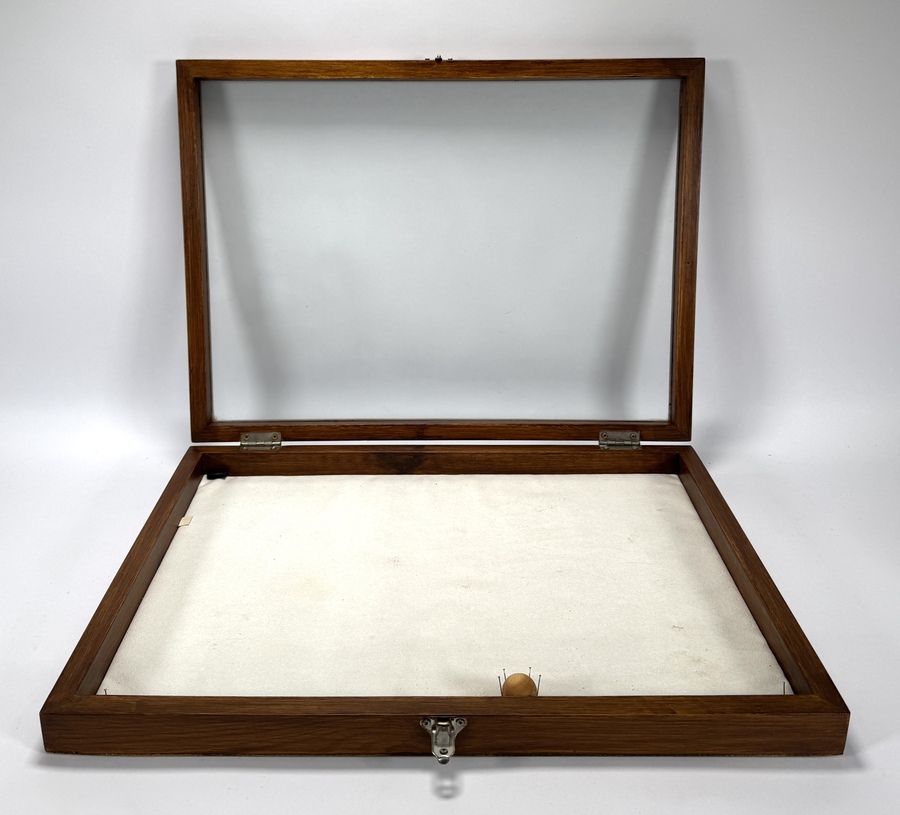 Entomologische vitrine met glazen deksel, gemaakt van hout en afgewerkt met een donkere beits, midden 20e eeuw. Het interieur bevat een prikbare ondergrond voor insecten en is voorzien van messing scharnieren en sluitwerk.