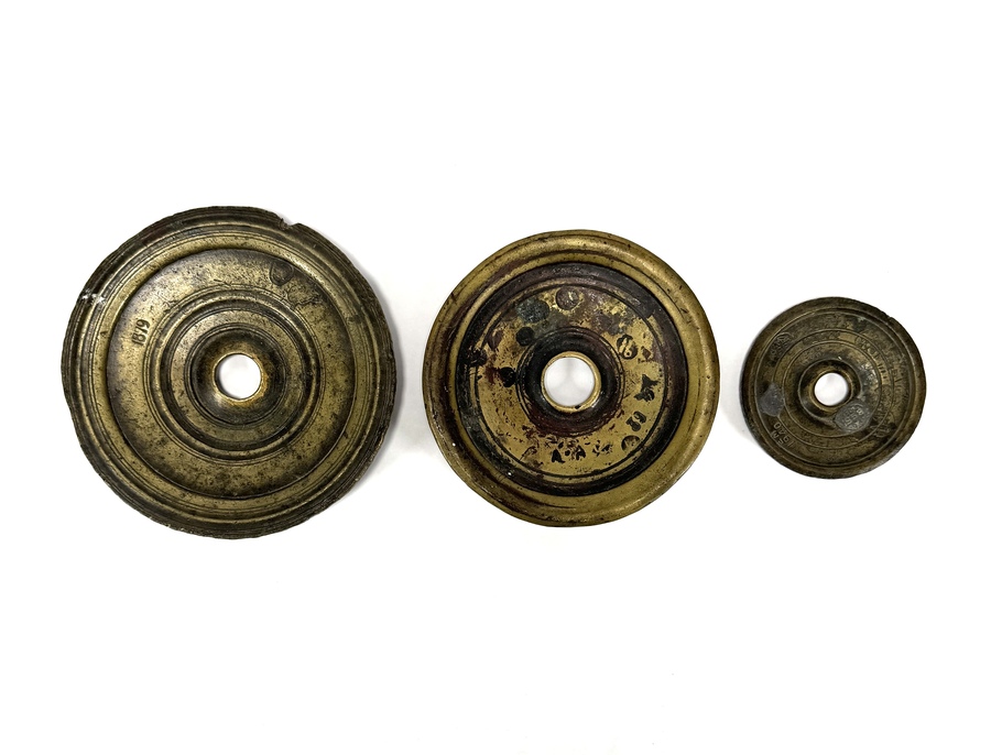Drie Ottomaanse dirhems van messing, elk cirkelvormig met centraal gat en sporen van gravering. De voorzijde toont concentrische ringen en Arabische inscripties met markeringen, de keerzijde glad gepatineerde oppervlakken. Gemaakt volgens traditionele giet- en stempeltechniek. De gewichten functioneerden als dirhems voor het wegen van munten of handelswaar in het Ottomaanse Rijk en dateren uit de tweede helft 19e eeuw. Het grootste gewicht bevat de gegraveerde datering '1879'.