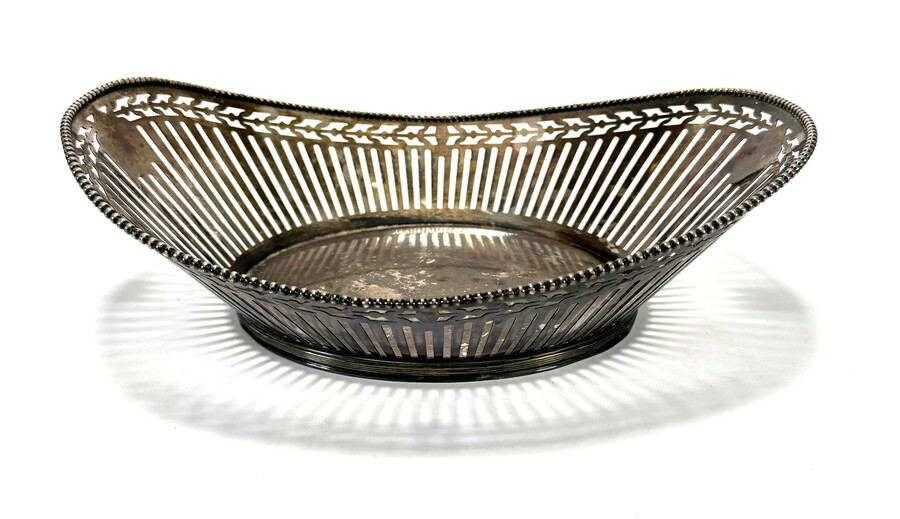 Pleet broodmand pleet, uitgevoerd in neoklassieke stijl uit de 20e eeuw. De ovale mand is geconstrueerd met een doorgebroken structuur van verticale spijlen en versierd met laurierfriezen aan de golvende rand.