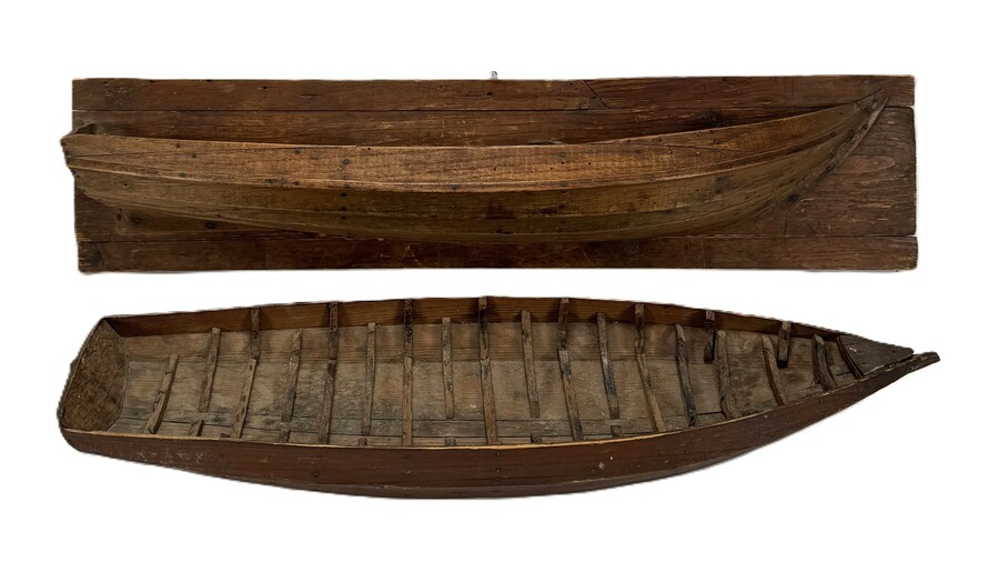 Een houten scheepsbouw halfmodel op een plank en een model van een ondiepe romp met spanten, vervaardigd uit gebeitst hout door middel van overnaadse beplanking. De maritieme voorwerpen dateren uit de eerste helft 20e eeuw (circa 1900-1940.)