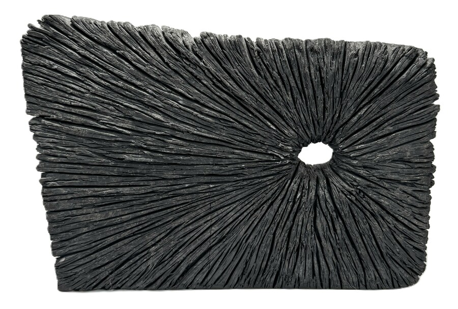 Abstracte kunstobject van handgevormd klei, met een diep mat zwarte kleur en daterend uit de periode circa 1960–1980. De vierkante vorm bevat een extreme vezelige textuur die radiaal uitstraalt naar een centrale opening, kenmerkend voor abstract expressionisme in keramiek.