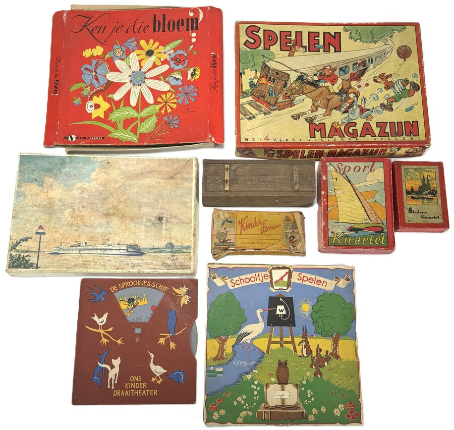 Tien historische kinderspelletjes en bezigheden, voornamelijk vervaardigd uit bedrukt karton en hout. De set bestaat uit bordspellen, een kwartetspel (o.a. Steden Kwarten 1953), domino, en draaitheater. De grafische stijl is kenmerkend voor Nederlandse kinderboekenillustratie van het midden 20e eeuw (circa 1930–1960), met heldere kleuren en nostalgische voorstellingen. De merken Victorie en ’t Koggescheepje zijn zichtbaar.