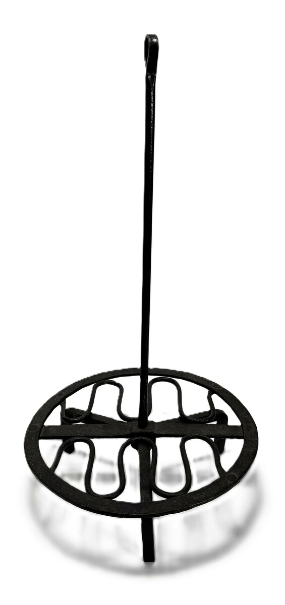 Driepotige haard trivet van gesmeed ijzer met cirkelvormig rooster met golvend patroon en centrale staaf met ringvormige handgreep/ophangoog. Gebruikt om kookgerei boven open vuur te plaatsen of gerechten warm te houden. Functioneel ontwerp zonder decoratie, typisch voor laat 18e/19e-eeuwse Europese haarduitrusting, vervaardigd in smeedtechniek met klinkverbindingen.